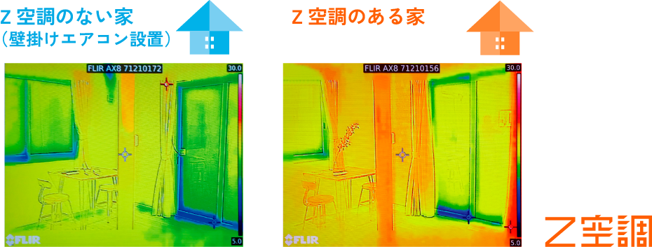 すると、同じ設定温度でも、Z空調のない家は部屋の上部と足元で温度ムラがありますが、Z空調のある家では、部屋中がほぼ同じ温度でとても快適。